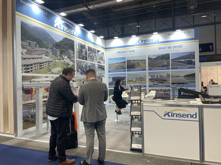 Kinsend Main Showcase Products Categories during exhibition: A variety of design solutions are available, including photovoltaic ground brackets, waterproof carports, ground ZAM steel structures, Trapezoid Roof PV System, various hooks ( fixed type , adjustable )for tile roofs, A variety of installation accessories for commercial and household rooftop mounting systems... etc...